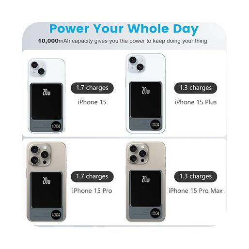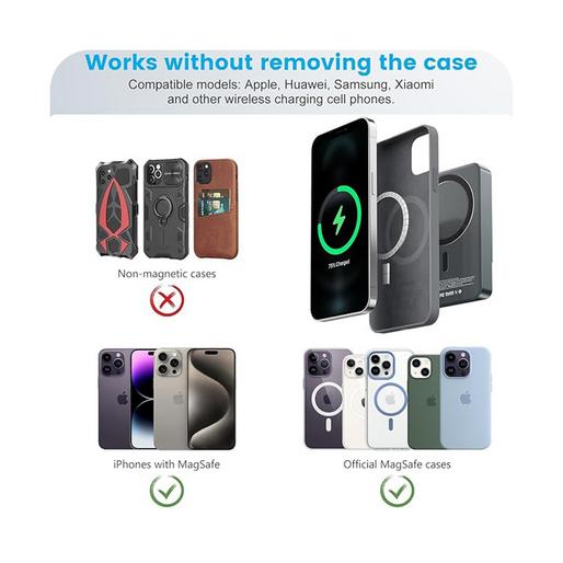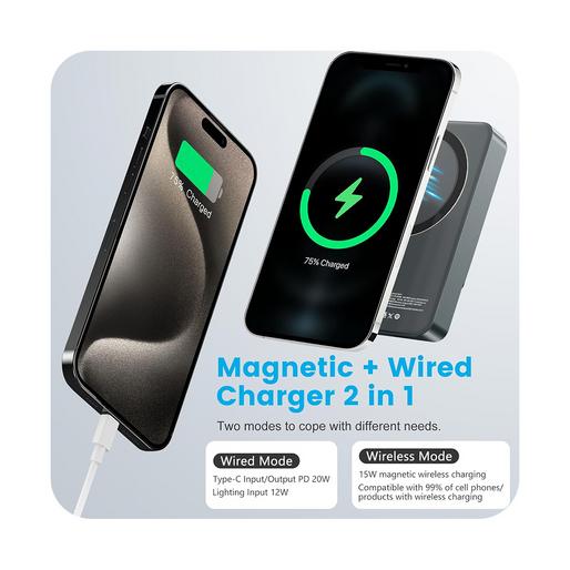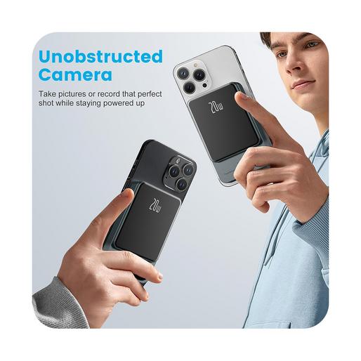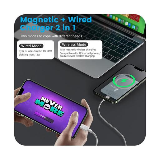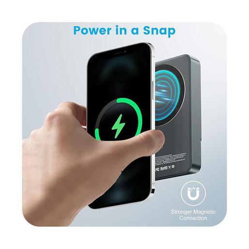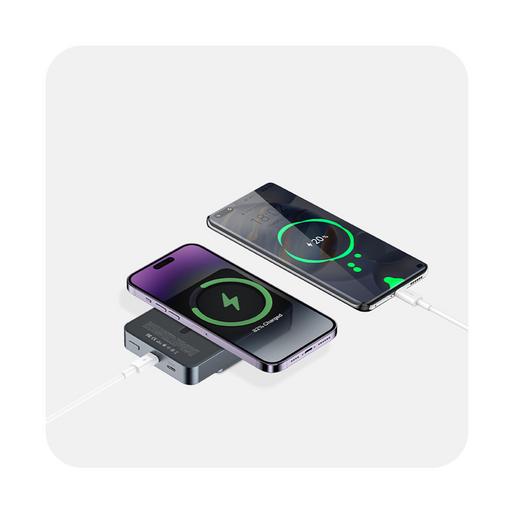 این پاوربانک از شارژ بیسیم با توان 5 تا 15 وات پشتیبانی میکند و با قابلیت مغناطیسی، اتصال پایداری به گوشیهای مجهز به مگسیف ایجاد میکند. همچنین، خروجی USB-C با توان 20 وات PD امکان شارژ سریع را برای دستگاههای مختلف فراهم میکند.این مدل از باتری لیتیوم پلیمری بهره می برد.