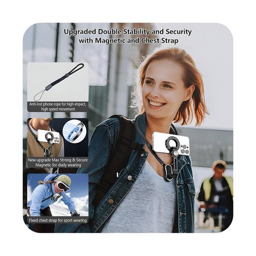 این محصول مجهز به ۲۰ قطعه مگنت آلومینیومی فوقالعاده قوی است که گوشی را کاملاً محکم نگه میدارد. دیگر نگرانی بابت افتادن گوشی هنگام فیلمبرداری نخواهید داشت. ای هولدر گردنی دارای ساختاری جمعشونده است که به راحتی در کیف شما جای می گیرد.