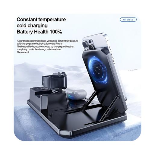 استند گوشی در ساختار این محصول علاوه بر داشتن قابلیت شارژ مگ سیف به صورت تاشو طراحی شده و امکان شارژ سریع گوشی در هر دو حالت عمودی و افقی را فراهم می آورد، همچنین مگنت های این استند از فاصله 8 میلی متری قدرت ربایش دارد و به صورت کاملا مطمئن گوشی را روی استند نگه می دارد. از سوی دیگر یک استند ویژه شارژ ایرپاد با توان 5 وات و یک استند تاشو برای شارژ انواع مدل های اپل واچ در ساختار بدنه محصول جای گرفته است.